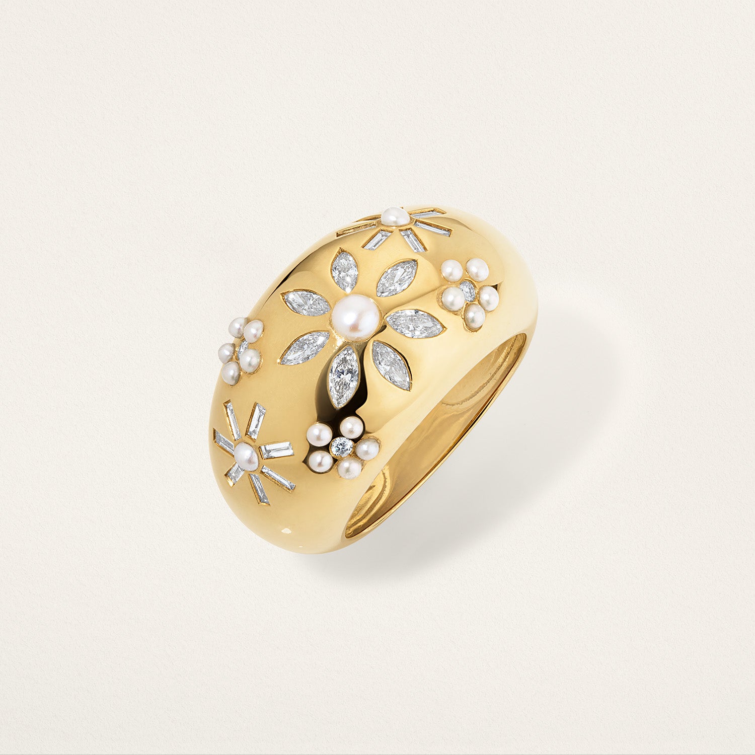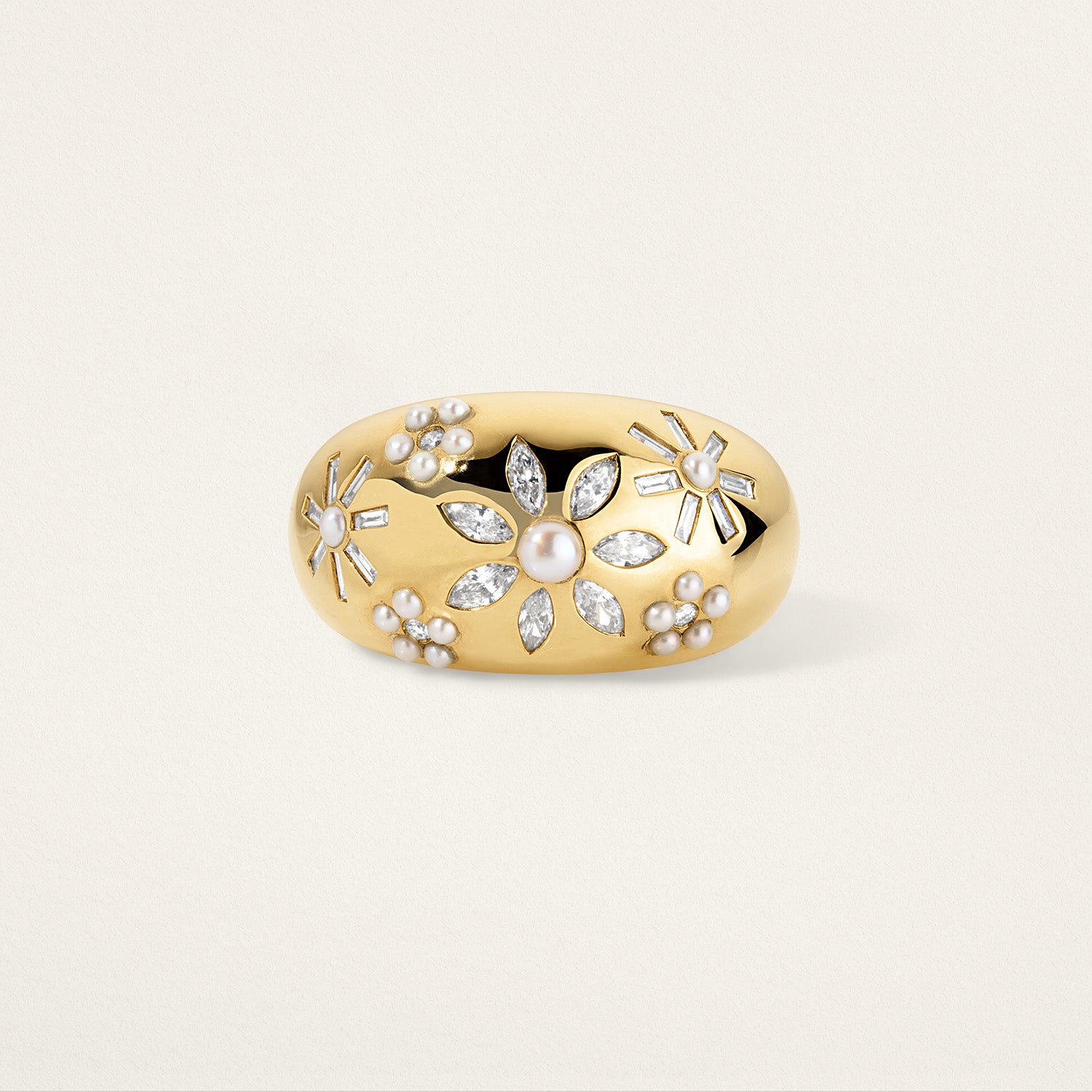 Flora is my interpretation of the timeless floral motif in jewelry - reimagined through glossy cabochon melee and delicate burnish-set details. In the Chunky Flora Nomad Ring, lustrous pearls and diamonds come together in a bold yet playful composition, celebrating the organic beauty of each gem.