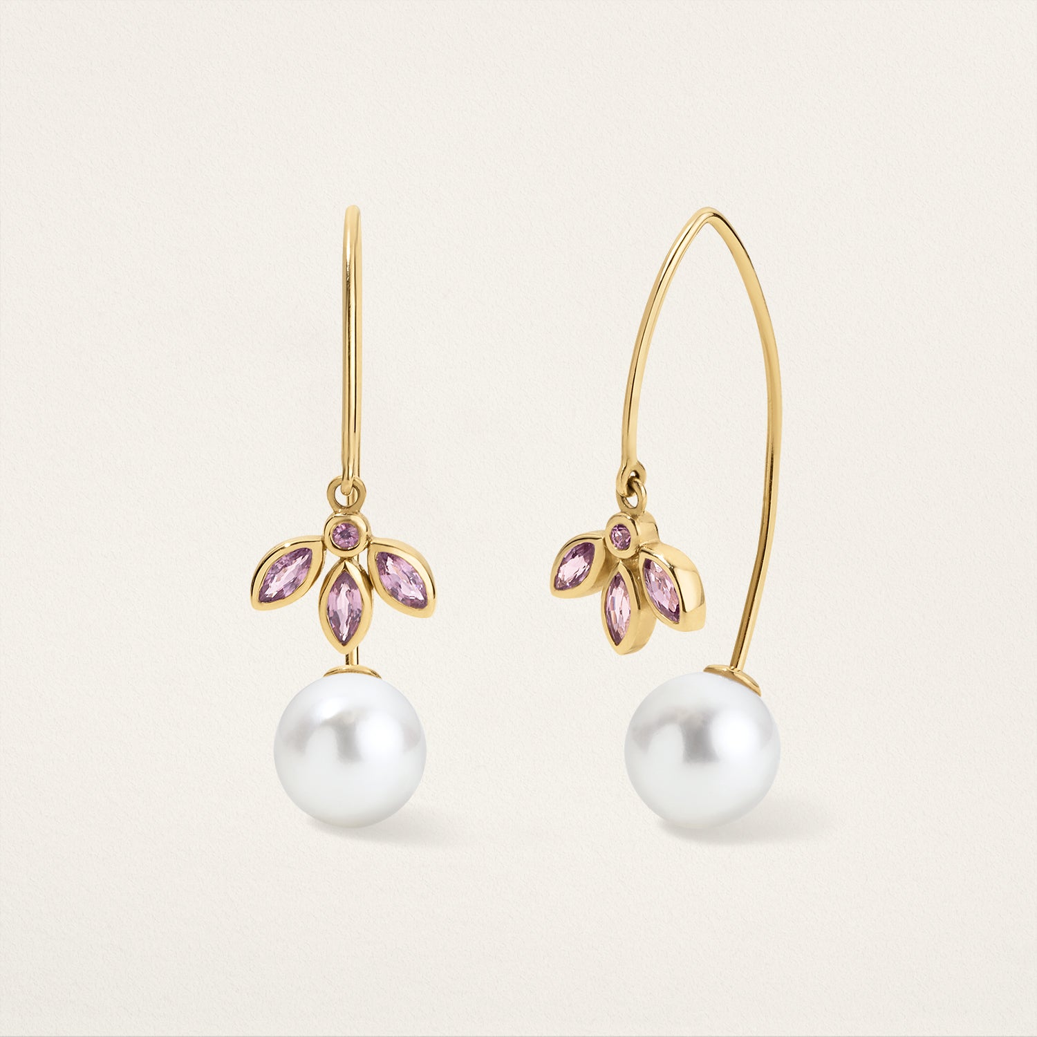 A sapphire flower takes center stage, delicate and detailed, while a luminous pearl secures the earring from behind. Thoughtfully designed and beautifully balanced, these drop earrings are truly one of a kind.